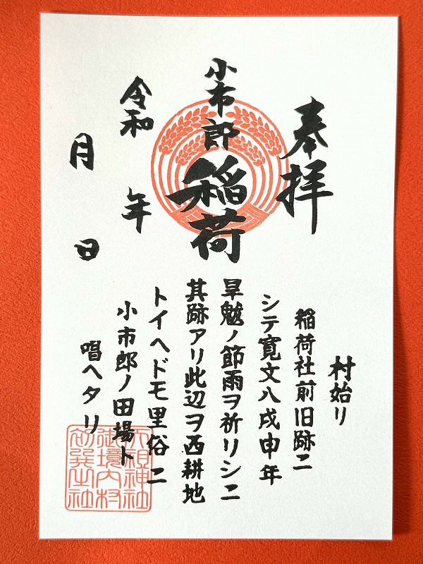 今回、稲荷社の御朱印が大きく変わります。慶応三年に作られた石碑に小市郎稲荷社の歴史を表した文言が刻まれており御朱印に入れ込みました。また、新年宝尽くし御朱印は日の出をイメージした配色で初春の喜びを表しています。